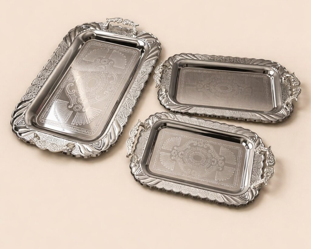 Make every occasion feel like a grand event. This 3-piece silver set is designed for the host who loves detail. Featuring ornate scrolled handles and a beautifully etched center motif, these trays are as much a piece of decor as they are a serving essential.