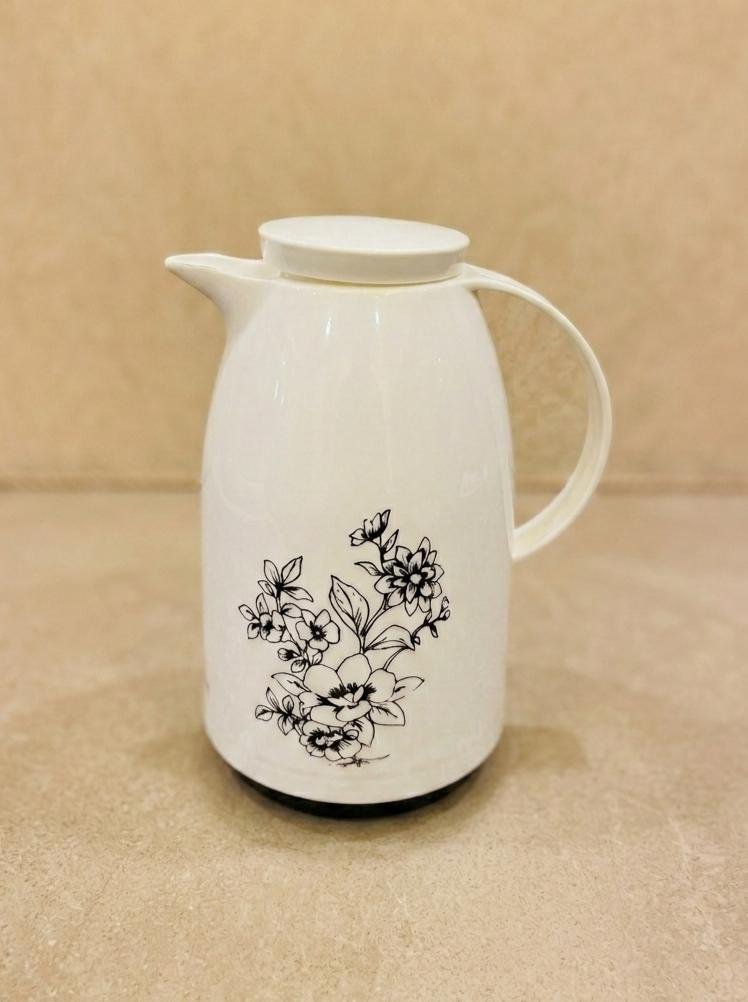 A classic vacuum flask designed with a clean white finish and elegant floral detailing that adds a refined touch to its timeless look. Built for both style and functionality, this flask helps maintain the temperature of beverages for longer periods, making it ideal for serving tea, coffee, or other drinks during gatherings or everyday use.
