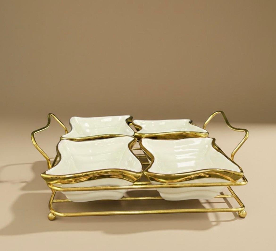 A 4-piece set of ceramic bowls with curved edges and hand-painted gold trim, resting in a minimalist gold-toned wire rack with waved handles. Stylish and functional, perfect for serving snacks, dips, or small bites.