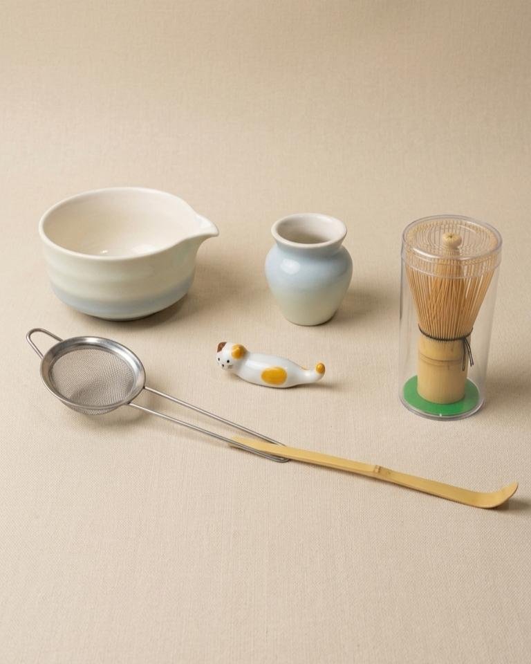 A 5-piece ceramic matcha bowl and whisk set in a beautiful blue-green finish, designed to bring an authentic and calming tea experience to your home. The set includes a finely crafted ceramic bowl, a traditional bamboo whisk, and essential accessories to prepare smooth, frothy matcha with ease. Made with quality materials for durability and daily use, each piece combines functionality with elegant design. Perfect for matcha enthusiasts, tea ceremonies, or as a thoughtful gift.