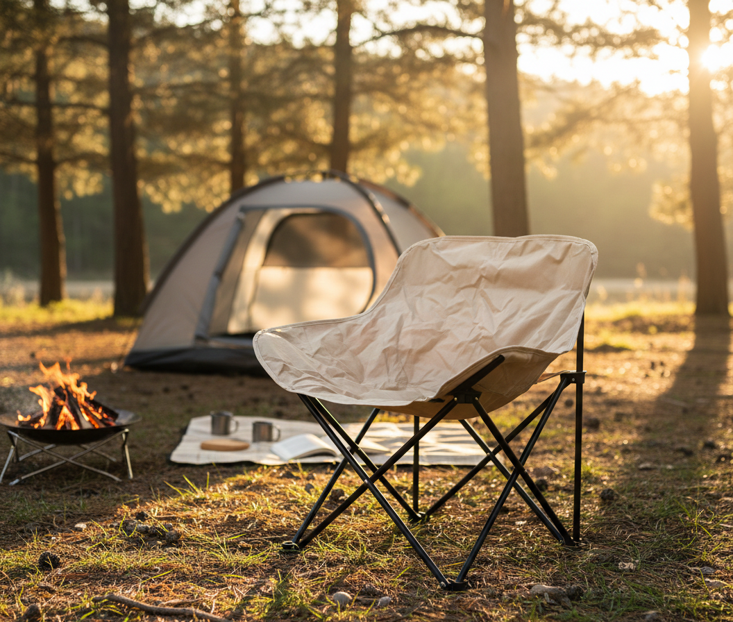 A practical and portable camping chair featuring a beige fabric seat supported by a black metal frame. This lightweight folding chair offers a comfortable seating solution for outdoor activities, camping trips, and recreational use.