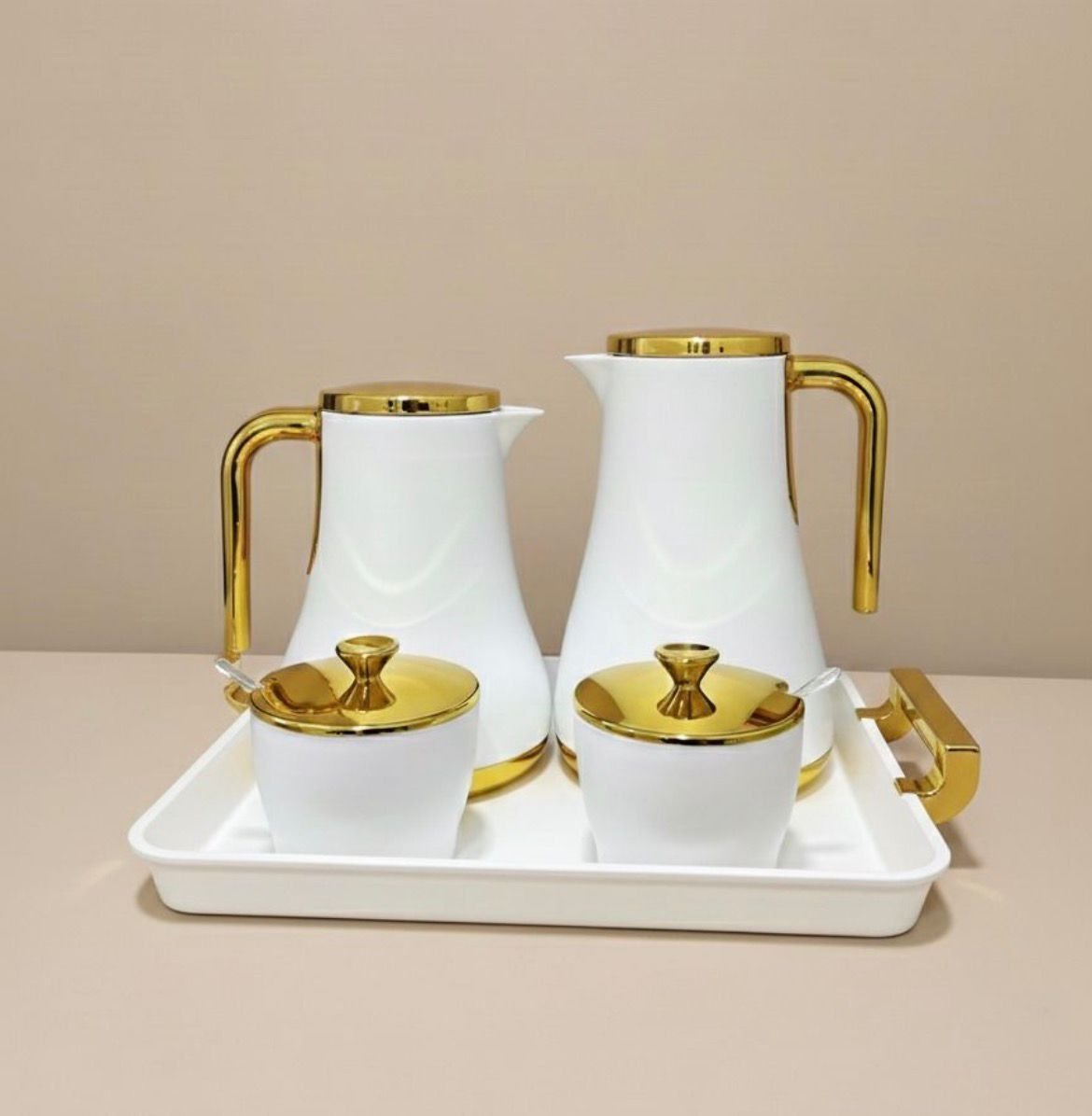 • Complete 5-Piece Set: Includes two high-quality insulated flasks, two matching pots for sugar or dates (with spoons), and a coordinated serving tray.