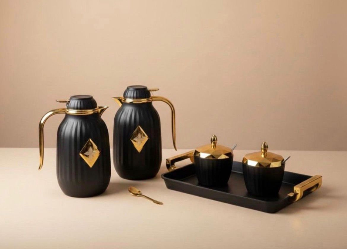 • Complete 5-Piece Set: Includes two high-quality insulated flasks, two matching pots for sugar or dates (with spoons), and a coordinated serving tray.
