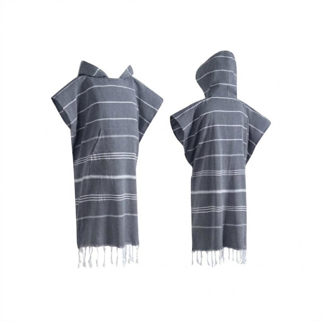 This Gray-and-White striped wearable beach towel is a practical poncho-style towel designed for comfort and convenience. With a hooded design and soft fringe details, it’s perfect for beach days, poolside relaxation, or changing after water activities.